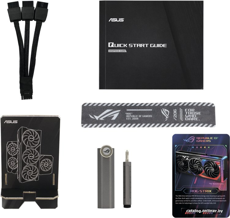 - Комплект поставки: 1 коллекционная карточка1 инструкция по быстрой установке1 кабель 16pin - 3x 8pin1 держатель видеокарты ROG 1 липучка Velcro ROG 1 благодарственная карточка