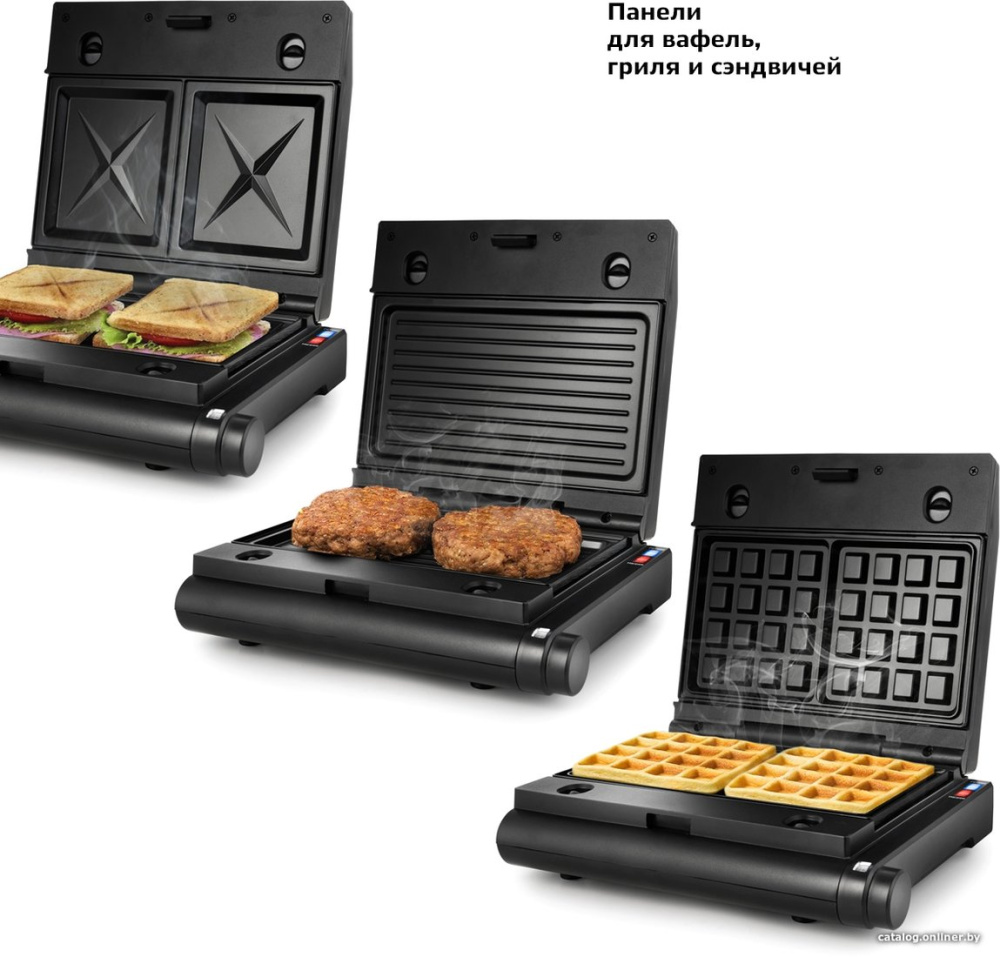 - Комплектация: ГрильСменные панели:- для гриля (установлены в устройство) - 2 шт- для сэндвичей - 2 шт- для вафель - 2 штРуководство по эксплуатации